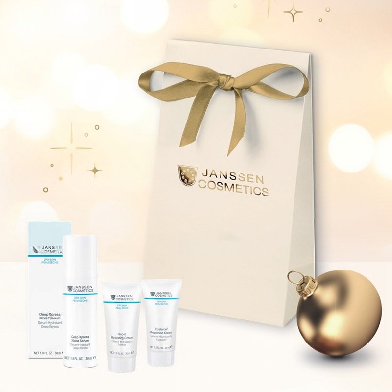 Settið kemur í fallegum gjafapoka og inniheldur 1x Deep Xpress Moist Serum 30ml, 1x Super Hydrating Cream 30ml & 1x Hyaluron3 Replenish Cream 30ml ásamt aukagjöf, vandaðri snyrtitösku frá Janssen Cosmetics.